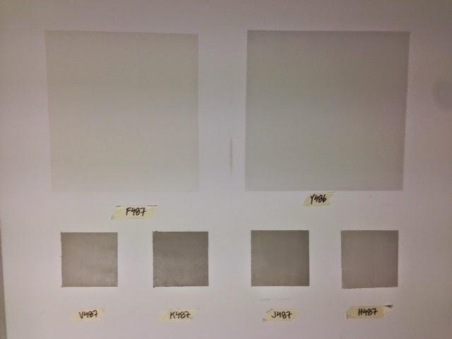 Tehostevärejä testattiin myös muutama, pääosin beigeen taittuvia sävyjä, mutta lopulta tehosteväriksi valikoitui harmaa sävy, joka ei päässyt edes seinätestiin.